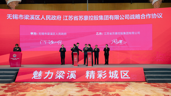 3月4日下午,蘇豪控股集團(tuán)與無錫市梁溪區(qū)人民政府在無錫隆重舉行江蘇蘇豪(無錫)科創(chuàng)園項目戰(zhàn)略合作簽約儀式。蘇豪控股集團(tuán)黨委書記、董事長王正喜與無錫市委書記黃欽進(jìn)行座談并出席簽約儀式??毓杉瘓F(tuán)總裁、黨委副書記周勇,梁溪區(qū)委書記許立新分別在簽約儀式上致辭。周謙副總裁,無錫市委常委、常務(wù)副市長朱愛勛參加簽約活動。王正喜董事長首先對無錫市各級黨委、政府對蘇豪控股集團(tuán)駐錫企業(yè)的關(guān)心表示感謝。他指出,無錫市制造業(yè)等實體經(jīng)濟(jì)實力雄厚、營商環(huán)境優(yōu)越,蘇豪控股集團(tuán)有多家駐錫企業(yè),其中江蘇省紡織研究所是省內(nèi)唯一以新型纖維為重