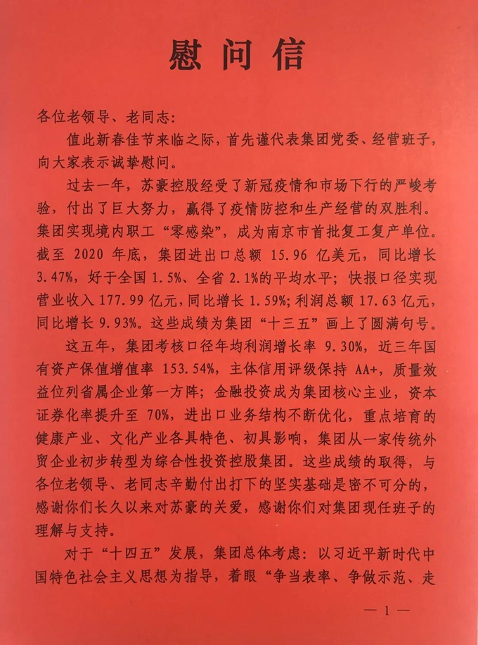 農(nóng)歷正月初七是新年上班第一天,集團(tuán)領(lǐng)導(dǎo)班子成員在黨委書(shū)記、董事長(zhǎng)王正喜帶領(lǐng)下,走訪了駐蘇豪國(guó)際廣場(chǎng)總部各部門(mén)及各子公司,給廣大干部職工拜年,并勉勵(lì)大家快速轉(zhuǎn)換狀態(tài),以飽滿(mǎn)的熱情投入到工作中,再接再厲,奮發(fā)進(jìn)取,在牛年新起點(diǎn)上開(kāi)創(chuàng)事業(yè)發(fā)展新局面。集團(tuán)總裁周勇、黨委副書(shū)記姚蓓、紀(jì)委書(shū)記陳萬(wàn)寧、副總裁劉長(zhǎng)春、副總裁周洪溶等領(lǐng)導(dǎo)一同給大家送上新春祝福和節(jié)日問(wèn)候。干部職工紛紛表達(dá)對(duì)集團(tuán)新一年發(fā)展的美好祝愿,歡聲笑語(yǔ)間洋溢著喜慶的節(jié)日氣氛。各單位都用“?!弊仲N紙、對(duì)聯(lián)、中國(guó)結(jié)、牛年吉祥物等裝飾辦公區(qū)域,鮮花吐艷、懸燈
