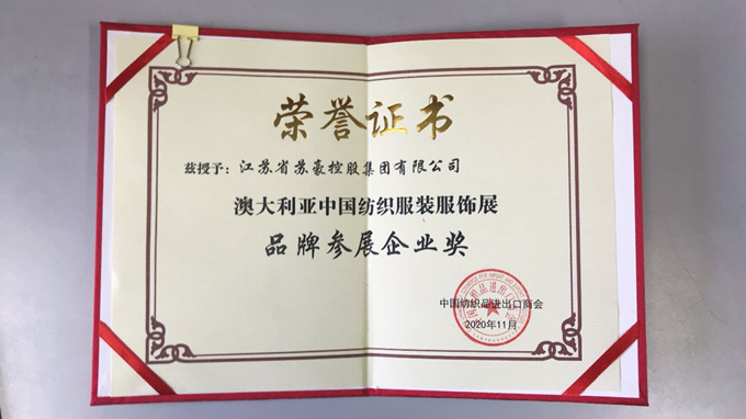 2020年11月12日,中國紡織品進出口商會在寧舉辦澳大利亞中國紡織服裝展20周年紀念活動,表彰為澳展成長壯大做出的突出貢獻的參展企業(yè)和展覽公司,蘇豪控股集團被授予“澳大利亞中國紡織服裝服飾展品牌參展企業(yè)獎”,集團黨委