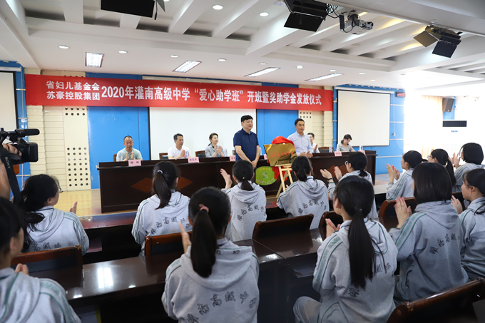 5月28日下午,蘇豪投資集團(tuán)捐建的灌南高級(jí)中學(xué)“蘇豪愛(ài)心助學(xué)班”舉行揭牌暨助學(xué)金發(fā)放儀式,蘇豪控股集團(tuán)黨委副書記姚蓓、灌南縣副縣長(zhǎng)王經(jīng)卓為愛(ài)心助學(xué)班揭牌,省婦兒福利基金會(huì)副秘書長(zhǎng)馬晨霞、蘇豪投資集團(tuán)董事長(zhǎng)薛炳