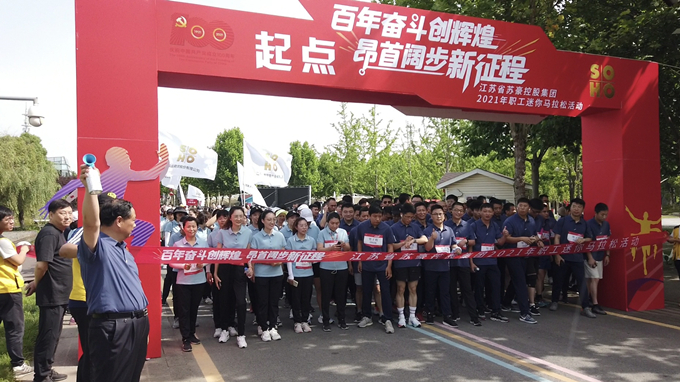 2021年5月28日,蘇豪控股集團(tuán)工會(huì)聯(lián)合會(huì)以“百年奮斗創(chuàng)輝煌 昂首闊步新征程”為主題,組織開(kāi)展職工迷你馬拉松活動(dòng),來(lái)自集團(tuán)總部及各二級(jí)子公司的11支代表隊(duì)伍、近800名職工,在青奧文化體育公園參與了全長(zhǎng)7.1公里的迷你馬拉松項(xiàng)目。集團(tuán)黨委書(shū)記、董事長(zhǎng)王正喜出席活動(dòng)并為開(kāi)賽鳴笛發(fā)令,集團(tuán)黨委副書(shū)記姚蓓、集團(tuán)紀(jì)委書(shū)記陳萬(wàn)寧、省國(guó)資委專(zhuān)職外部董事李結(jié)祥等領(lǐng)導(dǎo)參加活動(dòng)。周五的南京,陽(yáng)光明媚,青奧文化體育公園內(nèi)彩旗招展,“百年奮斗創(chuàng)輝煌 昂首闊步新征程”的背景板格外醒目,參加此次迷你馬拉松活動(dòng)的選手們將從這里出發(fā)