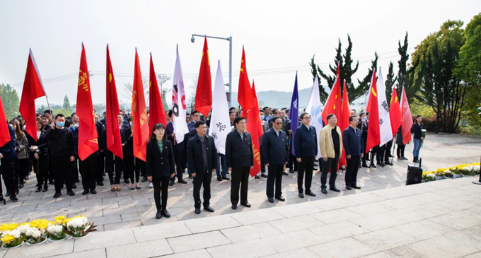 為緬懷革命先烈,傳承紅色基因,進(jìn)一步推動(dòng)黨史學(xué)習(xí)教育深入人心,4月13日上午,蘇豪控股集團(tuán)黨委在江寧橫山烈士紀(jì)念碑開展憑吊活動(dòng)。集團(tuán)黨委班子成員、二級(jí)公司班子成員、支部書記、黨務(wù)工作者、黨員代表、團(tuán)員代表、工會(huì)代表及總部黨員代表共179人參加。上午9時(shí),活動(dòng)正式開始,全體黨員整齊列隊(duì)革命烈士紀(jì)念碑前。兩名黨員代表將集團(tuán)黨委敬獻(xiàn)的花籃擺放至紀(jì)念碑前,集團(tuán)黨委書記、董事長(zhǎng)王正喜代表全體黨員鄭重整理挽聯(lián)。全體黨員向?yàn)槊褡褰夥哦⒂芦I(xiàn)身的革命烈士三鞠躬,沉痛默哀。在莊嚴(yán)肅穆的紀(jì)念碑前,集團(tuán)黨委副書記姚蓓帶領(lǐng)在場(chǎng)黨